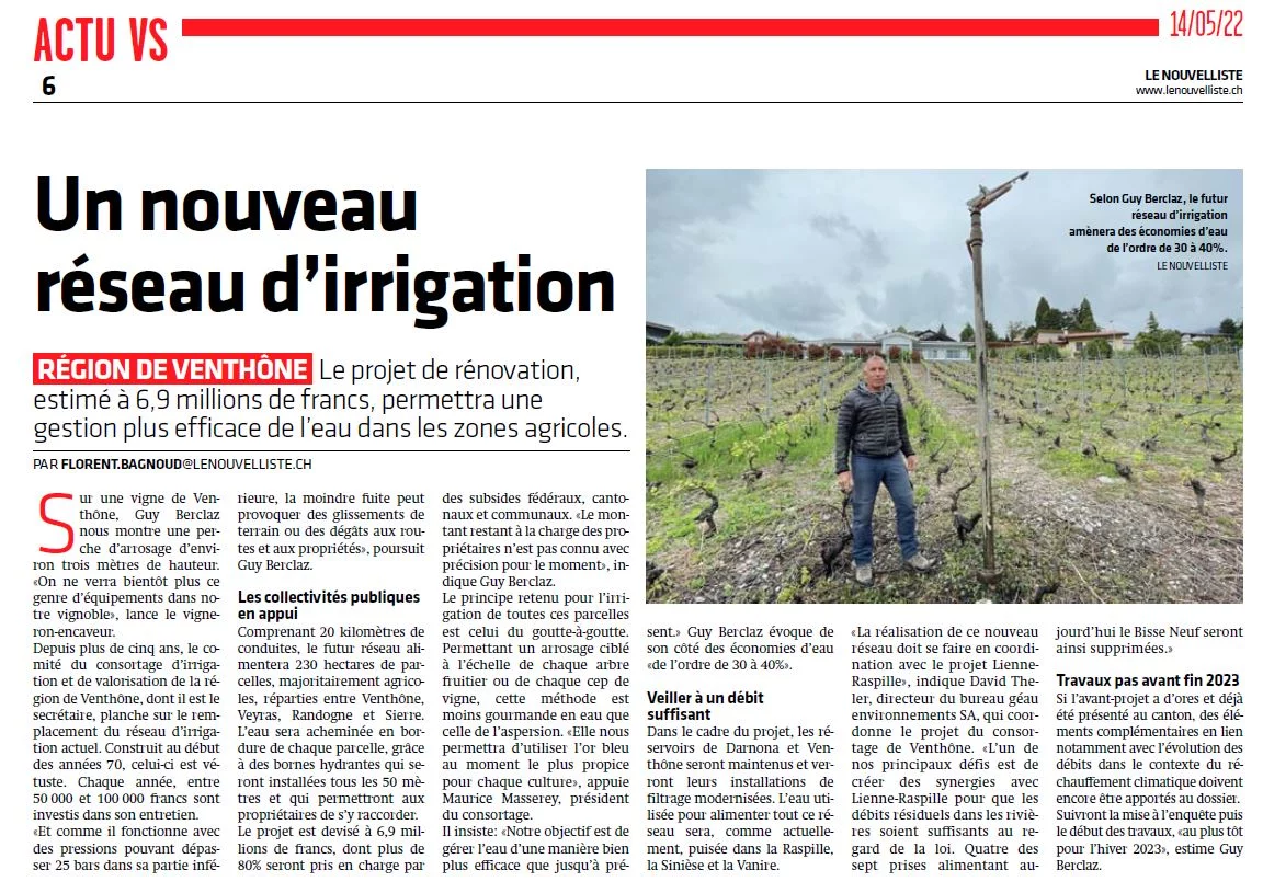 Article paru dans Le Nouvelliste du 14 mai 2022: "Un nouveau réseau d'irrigation"